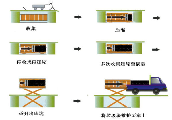 垃圾儲存、壓縮及寄存全部在地面以下,地面上沒有垃圾散落,對環(huán)境影響較?。焕鴫嚎s后密度高,水份少,可避免汽車運輸中的垃圾散落、污水滴漏現(xiàn)象,避免二次污染;